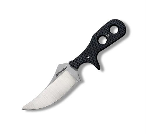 Cold Steel's new generation of Mini Tac Neck Knives are astonishingly light at 3 ounces each. Because they're so lightweight, they can be comfortably worn practically 24 hours a day. With their sturdy bead chain lanyards and their rugged Secure Ex(R) sheaths (specially designed to snugly retain the knife while allowing a speedy draw stroke), they can be worn outside clothing and perform as a handy utility or rescue knife. They can also be carried more discreetly under a shirt or blouse, or inside a coat. They can even be used for camping or hiking as they can easily be tied or taped anywhere from a backpack to a fanny pack. Their versatility is virtually endless. Fashioned from AUS 8A stainless steel and reflecting state of the art heat treatment they are honed to a razor edge and exhibit incredible toughness for such a small knife, due in part to their full tang construction. Tough, rough, and ready for anything, they come equipped with thin high quality black G-10 handle scales. This feature allows them to lie flat and close against the body and provide an aggressive gripping surface. Also when these scales are combined with integral sub hilt they give the fingers of the hand incredible purchase and allow a remarkably secure grip that resists rolling or twisting: Provides a long, curved cutting edge with a sharp point. It's ideal for cutting slashing and skinning strokes. It's been extensively fieldtested in Australia where it single handedly caped a huge buffalo slicing through neck skin over 1" thick. Weight: 2.2 oz. Blade Thickness: 2.5 mm. Blade Length: 3 3/8". Steel: Japanese AUS 8A Stainless. Overall: 6 5/8". Handle: 3 1/4" Long G-10. Secure-Ex(R) Neck Sheath.