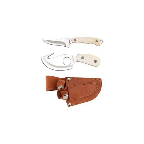 - Set includes: skinning knife with gut hook and bone handle measuring 7.overall, with a 2-3/4.blade, caping knife with bone handle measuring 6-3/4.overall, with a 3-1/2.blade, and leather sheath. Limited lifetime warranty. Clamshell.